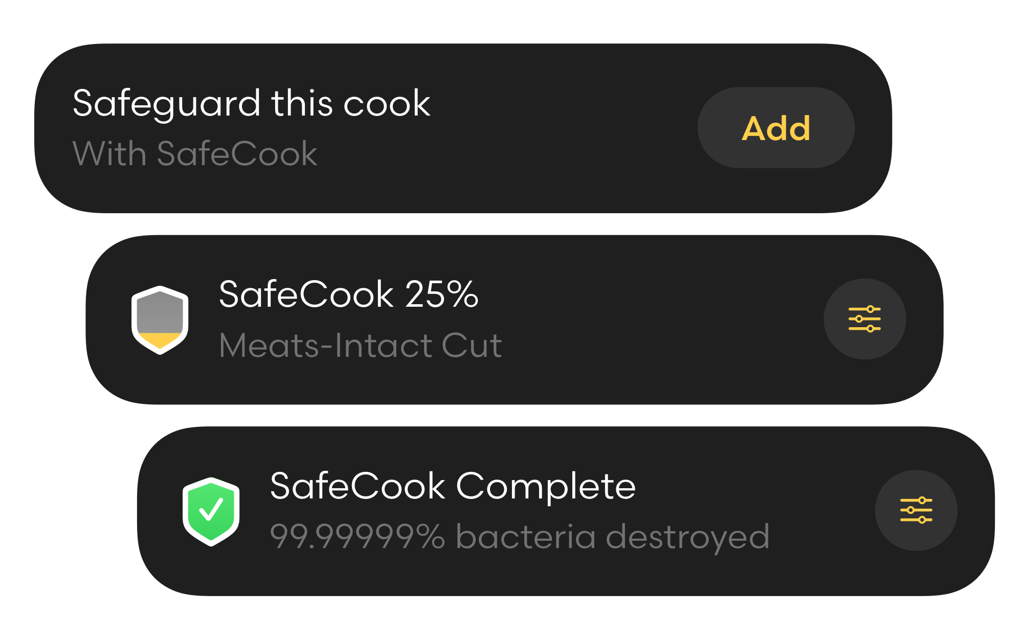 Stop overcooking, just to be safe. Pick your protein and let SafeCook™ tell you exactly when it's safe and delicious. It tracks both time and temperature throughout cooking to calculate when your food is safe - so you'll never have to overcook "just to be safe" again.