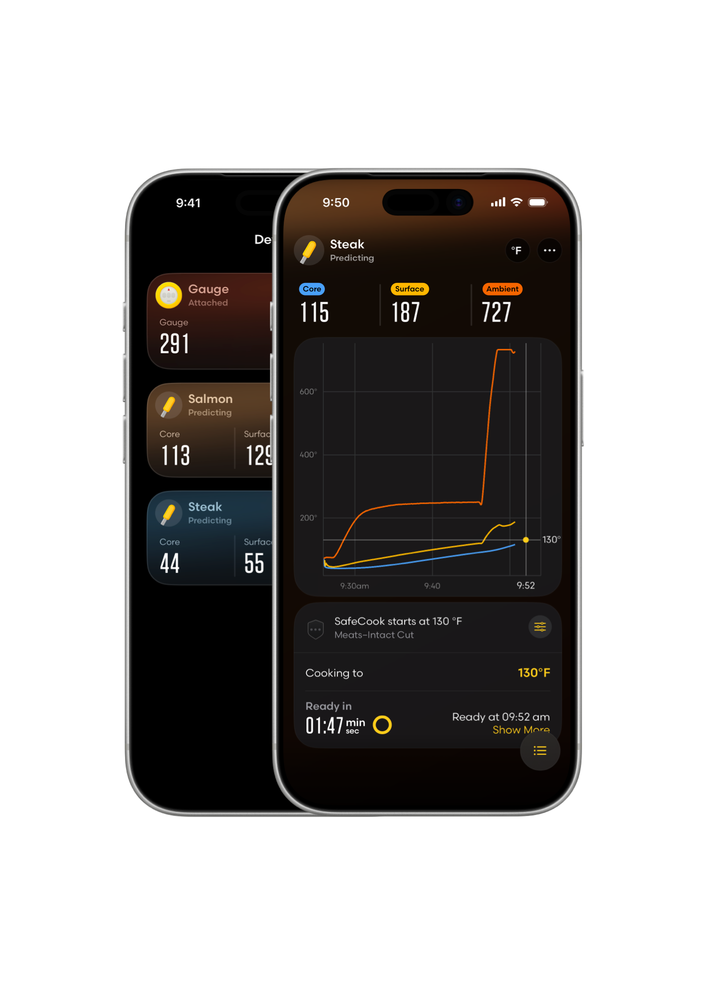 Control the Predictive Thermometer and other Combustion tools. Set target temp and select SafeCook™ settings. See key temperatures throughout your food and get an exact countdown to the time your food will hit that target temp.